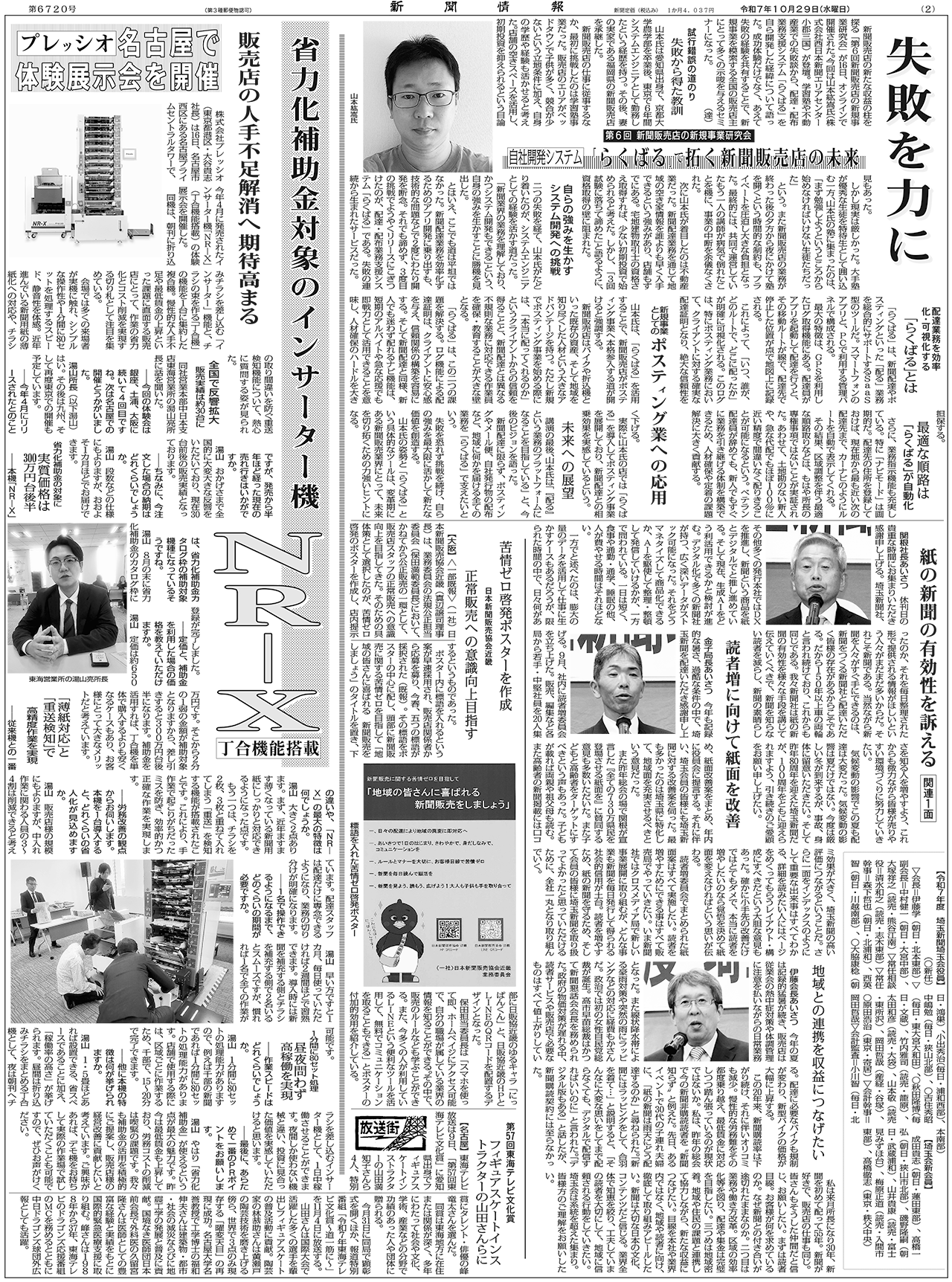 2025年10月29日付「新聞情報」の2面に、名古屋で開催したインサーター機「NR-X」(丁合機能搭載)の展示会に関する記事が掲載されました。